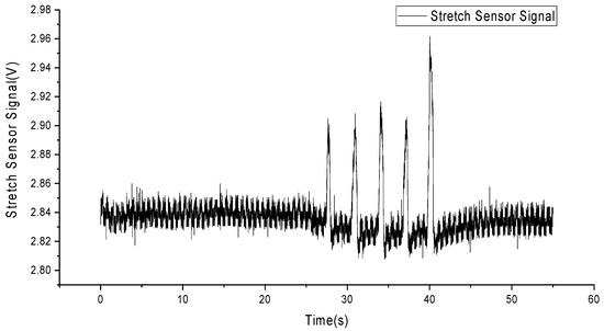 To detect skin stretching signals, we employed flexible and stretchable sensors made from liquid metal particles [51]. These sensors were attached to the skin surface a few millimeters away from the electrodes, with one sensor placed horizontally and the other vertically to the ground plane, as shown in Figure 3. The circular patch in the top right corner represents a traditional electrocardiogram electrode, while two elongated stretch sensors are placed to the left and below it. The sensor signals were processed through an amplifier, converted to digital signals by an analog-to-digital converter, and then saved as data files on a computer. Figure 4 shows the deformation signals captured by the sensors when the skin was stretched manually, with a total of five stretches performed.