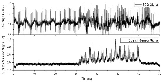As observed in Figure 8, (a) during the initial 30 s of stillness, the stretch sensor signal remains stable, and the ECG signal is relatively stable without significant interference. (b) From 30 to 60 s, during the running exercise, the stretch sensor detects a pronounced skin stretching signal, and there are evident MAs present in the ECG signal. (c) In the final 10 s of stillness, the stretch sensor signal returns to a stable value, and the ECG signal also stabilizes. This indicates that skin stretching is a source of MAs in ECG signals and is correlated with these artifacts.
