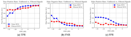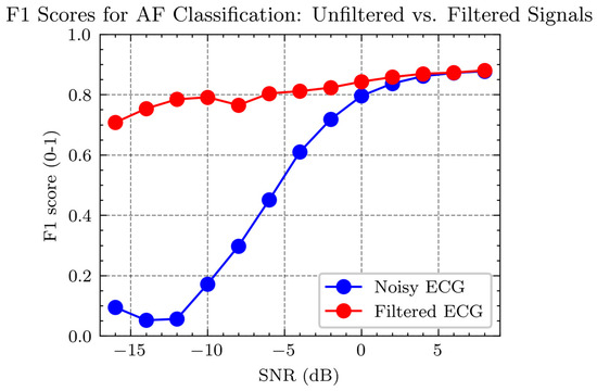 In Figure 11, two curves are presented: the red curve represents the F1 score for AF detection in noisy ECG signals—those not subjected to any filtering process. The blue curve signifies the F1 score for AF detection in filtered ECG signals—those processed to remove noise using a filter. The graph illustrates that the F1 scores for AF detection improve with an increase in SNR for both conditions, but the filtered ECG consistently demonstrates higher F1 scores across the SNR spectrum than the noisy ECG. Particularly at low SNR levels (SNR < 0 dB), filtering significantly enhances the F1 score for AF detection, underscoring the effectiveness of filtering in improving AF detection performance in low-quality ECG signals.