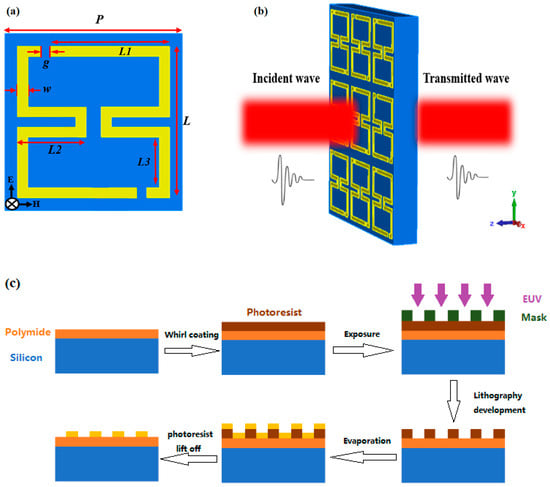 An asymmetrically folded dual-aperture metal ring terahertz metasurface sensor was designed. The schematic diagram and principle of the sensor unit structure are illustrated in Figure 1a,b [35]. The bottom layer is polyimide (PI), with a thickness of , and the top layer is gold, with a thickness of . The structural dimensions include a unit cell period , , line width and opening gap ; the terahertz wave propagates along the negative z-axis, and the electric field direction is along the y-axis. The electromagnetic simulation software CST Studio Suite 2020 was used to perform the simulation calculations using the finite–difference time-domain (FDTD) method. The preparation of the metasurface was carried out by using photolithography at the 13th Research Institute of China Electronics Technology Corp (Shijiazhuang, China). AZ5214 reverse adhesive was selected for the photoresist, and its positive adhesive properties were utilized. The mask pattern is the opposite of the required structural pattern. When UV light shines on the photoresist through the non-shading part of the mask, the photosensitive agent in the photoresist will decompose and become a solubility enhancer. The photoresist here is readily soluble in the alkaline developer, and no chemical changes occur in the shading area. A gold film was plated on the substrate surface via vacuum evaporation. In order to increase the adhesion between the gold film and the photoresist, a layer of chromium film must be plated before gold plating. After gold plating, the residual photoresist is cleaned off to form the desired metal structure. The preparation process is shown in Figure 1c.