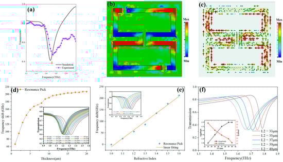 Asymmetric folded double open ring’s (a) experimental characterization and simulation comparison; (b) surface electric field distribution; (c) surface current distribution; (d) the influence of the thickness of the cover on the frequency shift of the resonant peak; (e) the influence of the change in refractive index on the resonant peak frequency shift; and (f) the effect of L2 size on sensor performance.