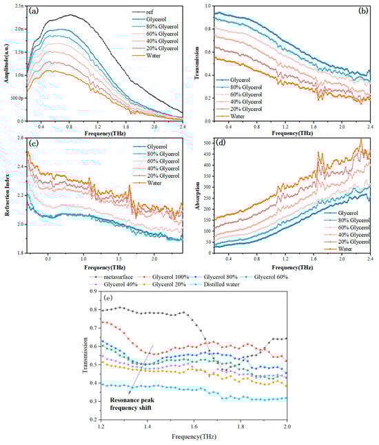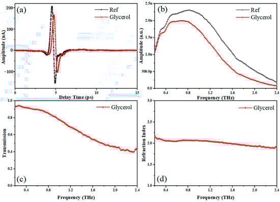 It is known that water exhibits strong absorption in the terahertz range. When using water as a solvent to detect trace substances in the terahertz band, it is necessary to consider whether the fingerprint spectrum of the substance will be submerged in the aqueous solution and whether too thick an aqueous solution will cause the spectrum width to decrease. The working principle of a terahertz metasurface sensor is that the refractive index and dielectric constant of the near surface change due to the change in substance concentration or mass, which causes the resonant peak frequency shift. However, current terahertz metasurface sensors often require a sufficiently thick cover layer to ensure their sensing performance [36]. Using polar solvents to carry out mixing with water can reduce the absorption of terahertz waves by water while ensuring a certain solubility. A method of mixing glycerol with distilled water in proportion as an alternative to a pure water cover has been proposed. Glycerol, as a polar solvent, has advantages such as low biological toxicity, arbitrary compatibility with water in any ratio, and a certain ability to dissolve biological molecules [37,38]. The frequency domain, transmission, and refraction index spectrum of glycerol are shown in Figure 5. Despite being a polar solvent, glycerol exhibits good transparency in the terahertz range and shows no significant absorption peaks in the 0.2–2.4 THz frequency range.