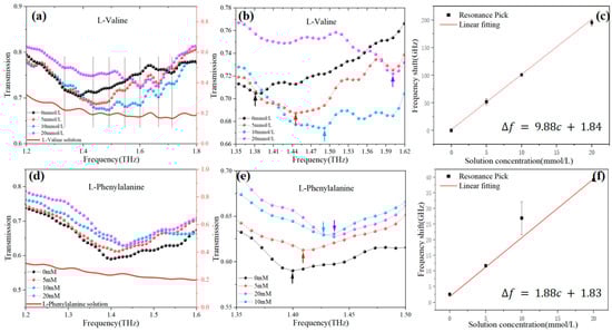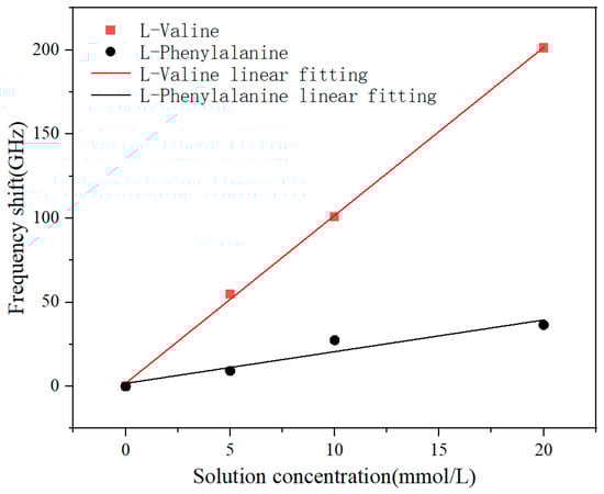 Before the experiment, 2.34 mg and 1.17 mg of L-Valine and 3.30 mg and 1.65 mg of L-Phenylalanine were dissolved in a 1 mL solution of water mixed with glycerol with a volume ratio of 2:8. In this way, the L-Valine and the L-Phenylalanine solutions with a concentration of 20 mmol/L and 10 mmol/L could be matched. As for a solution with a concentration of 5 mmol/L, it is too difficult and inaccurate to weigh 0.585 mg manually. The dilution method was used to mix 500 μL of 10 mmol/L concentration solution with 500 μL of solvent. Figure 7a presents the transmission spectra detected on the metasurface covered with solutions of different concentrations of L-Valine. It was observed that with an increase in solute concentration, the resonance troughs of the sensor gradually blue-shifted. The bold red line in the graph represents the transmission spectrum of the L-Valine solution, where the transmission notches correspond to the weak absorption of the solid pellets and the jitter observed at the same frequency during the sensor experiments. From this, it is assumed that the peaks of the jitter observed during the sensor experiments are caused by the solute in the L-Valine solution, and the significant amplitude of the jitter observed during sensor experiments is evidently the result of modulation amplification by the sensor. The spectrum shown in Figure 7b was obtained by eliminating the influence of the solute in the sensor detection spectrum results. The experimental spectral resolution in this paper is 9 GHz. The frequency shifts were fitted and analyzed against the solution concentrations, yielding a linear relationship of , with a concentration sensitivity of (Figure 7c).
