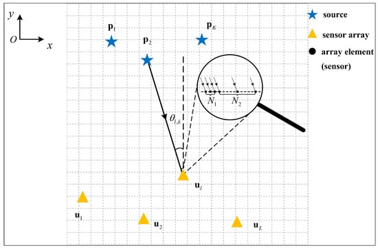 In the context depicted in Figure 1, we analyze a scenario where K incoherent non-Gaussian sources emit narrow-band stationary signals in a two-dimensional localization setting, with unknown positions. It is assumed that the quantity of sources K is predetermined, and various established techniques can be employed to ascertain it [34,35]. To pinpoint these unidentified sources, we deploy L spatially distributed sensor arrays, each furnished with a NA comprising M array elements. The positions of the sources and sensor arrays are represented as and , respectively. The signal received by the lth sensor array at the tth snapshot can be formulated as per [36]: