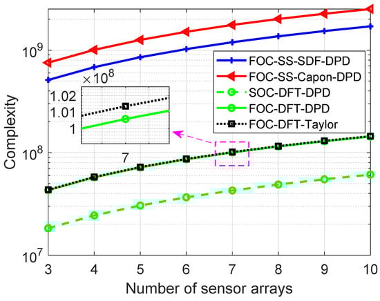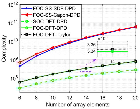 Figure 3 shows the computational complexity of four different algorithms with the parameters setting as below: , , , , and the number of array elements is changed from 6 to 20. As we can see, compared to the FOC-SS-SDF-DPD and FOC-SS-Capon-DPD algorithm, the proposed FOC-DFT-DPD and FOC-DFT-Taylor algorithms reduce the computational complexity, as they are less sensitive to the number of array elements M. The complexity of the proposed FOC-DFT-Taylor algorithm is a bit heavier than that of FOC-DFT-DPD and SOC-DFT-DPD algorithms.