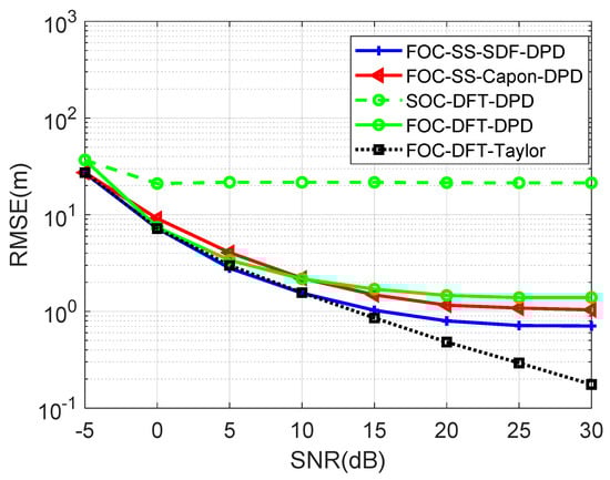 Figure 5 depicts the RMSE of four algorithms versus SNR when the number of Monte Carlo runs is 600, , , , , , , , , , , , , SNR is changed from to , and the gap of search grids is 1 m. Observe that the RMSE values of the four algorithms exhibit close proximity except for the SOC-DFT-DPD algorithm when SNR is below 10 dB, thanks to the property of non-Gaussian sources. The proposed FOC-DFT-Taylor algorithm demonstrates superior performance over the others at SNR levels exceeding 10 dB, showcasing its exceptional capabilities. Moreover, the RMSE associated with the proposed FOC-DFT-Taylor algorithm consistently remains below that of the FOC-DFT-DPD algorithm at the expense of performing Taylor compensation.