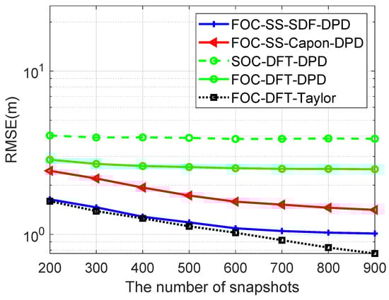 Figure 6 shows the RMSE of four algorithms versus T when the number of Monte Carlo runs is 600, , , , , , , , , , , , , the number of snapshots is changed from 200 to 900, and the gap of the search grids is 1 m. The localization performance of the FOC-DFT-DPD and SOC-DFT-DPD remains consistent, as they do not operate as super resolution algorithms and are constrained by M. Thanks to the property of non-Gaussian sources, the localization accuracy of the FOC-DFT-DPD is higher than that of SOC-DFT-DPD. Moreover, the RMSE values of the FOC-DFT-Taylor algorithm consistently outperform the other three algorithms due to its compensation method, showcasing its superior accuracy in localization.