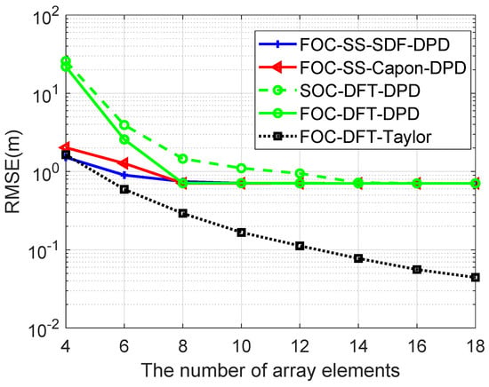 Figure 7 shows the RMSE performance of different algorithms versus the number of array elements M over 500 Monte Carlo runs, when , , , , , , , , , , , , the number of array elements is changed from 4 to 18, and the gap of the search grids is 1 m. Observe that when the array size exceeds 8, the RMSEs of FOC-SS-SDF-DPD, FOC-SS-Capon-DPD, and FOC-DFT-DPD algorithms stabilize around 0.7 m due to their inability to address off-grid errors. In comparison, the RMSE values of the proposed FOC-DFT-Taylor algorithm consistently outperform the other algorithms thanks to its compensation method, demonstrating superior accuracy in localization. Unfortunately, the SOC-DFT-DPD performs poorly, as it fails to take full advantage of non-Gaussian sources. Furthermore, the RMSE values of FOC-DFT-DPD decrease as the array size increases, indicating that localization accuracy is constrained by the number of array elements.