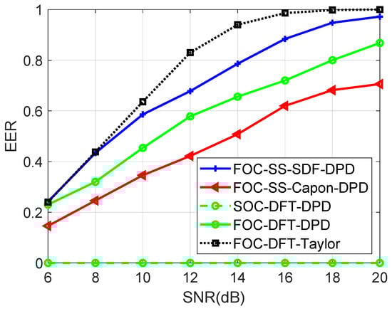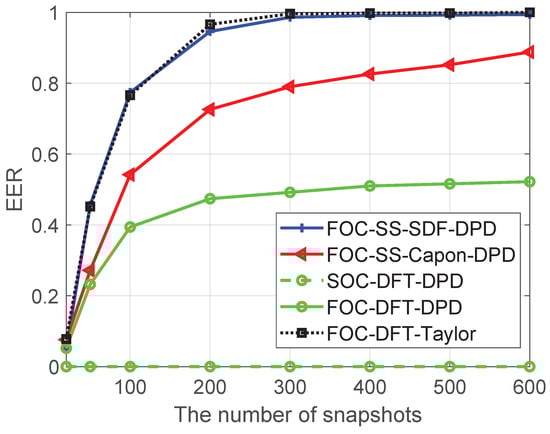 Figure 9 shows the EER of four algorithms versus T, when the number of Monte Carlo runs is 600, , , , , , , , , , , , , the number of snapshots is changed from 20 to 600, the gap of search grids is 1 m, and the error threshold is set as 1 m. The EER of the proposed FOC-DFT-Taylor algorithm shows a slight increase compared to the FOC-SS-SDF-DPD algorithm, yet with a significant reduction in complexity. Unfortunately, the SOC-DFT-DPD performs poorly, as it fails to take full advantage of non-Gaussian sources. Additionally, when compared to the FOC-SS-Capon-DPD and FOC-DFT-DPD algorithms, the EER of the FOC-DFT-Taylor algorithm is higher, underscoring its superior resolution capabilities.