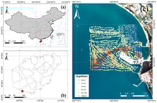 The location of the port and bathymetric rendering by sonar. (a) The location of Hainan Island, (b) the location of Nanshan Port, (c) the location of Nanshan Port Remote sensing data and measured data. (The red part of (a) is Hainan Island, and red star in (b) represents the location of Nanshan Port).
