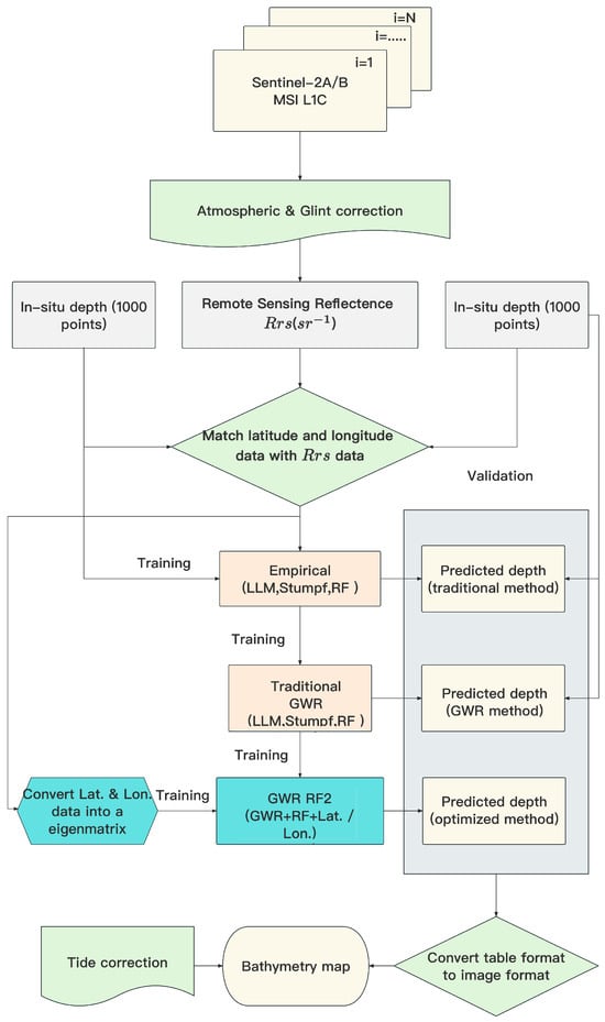 In this study, as Figure 2 shows, the approach involves two stages. First, we select high-quality remote sensing images and apply atmospheric correction to ensure accurate reflectance data. We then estimate water depth using various bathymetry algorithms, considering tide effects for consistency. In the second stage, we convert and utilize data for training and prediction, including processing Sentinel-2 data into a tabular format and matching the latitude and longitude with Rrs data. Then, we predict the depth with the GWR model and the RF model. The performance assessment involves comparing predicted depths with in situ measurements, demonstrating significant error reduction and enhanced accuracy. By structuring our approach into these stages and optimizing data usage, we developed a reliable method with potential applications requiring precise water depth information.