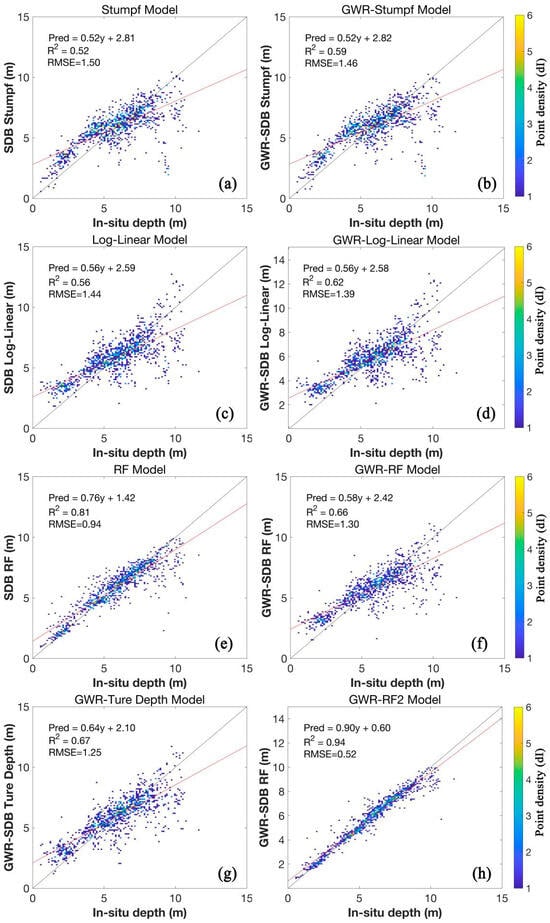 Bathymetry result between the in situ depths and predicted data. (a) Stumpf; (b) GWR-Stumpf; (c) Log-liner; (d) GWR-Log-liner; (e) RF; (f) GWR-RF; (g) GWR-Ture Depth Model; (h) GWR-RF-Lon./Lat. Grey stands for the 1:1 line, pink stands for the regression line of the scatter plot.