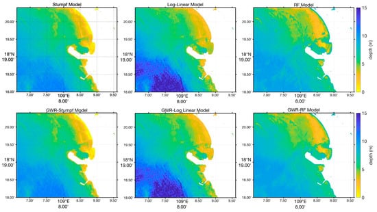 In the 3–8 m depth range, all models exhibit consistent trends, yet the Stumpf model and the log-linear algorithm show more noisy data points within a triangular region compared to the Random Forest model. In water depths exceeding 10 m, especially in harbor navigation channels, the GWR model with latitude and longitude features yields more accurate results.