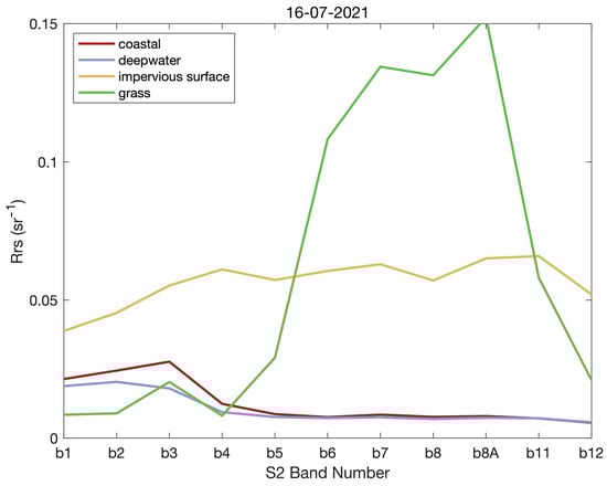 (a) Data Quality: For instance, noise or interference from atmospheric or water turbidity factors may introduce errors in remote sensing data. We applied ACOLITE atmospheric correction to reduce these effects and plotted the average surface reflectance values of different regions around the study area in Figure 6. The spectral shapes of each habitat (coastal, deep water, impervious surface, and grassland) show their signal differences. The spectral curves indicate that ACOLITE atmospheric correction preserved the spectral characteristics of different types of ground objects.