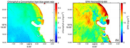 (a)The chlorophyll a and (b) suspended particulate matter (SPM) concentrations derived by ACOLITE software.