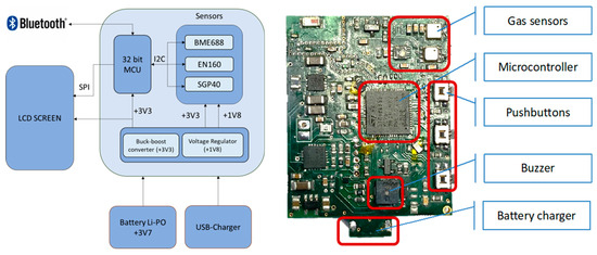 Figure 3 depicts, on the one hand, the internal block diagram of the electronics of the smartwatch and, on the other hand, an actual image of its electronic prototype. As can be appreciated in the diagram on the left, the watch integrates three MOX-type sensor modules: the BME688 from Bosch (Gerlingen, Germany), the SGP40 from Sensirion (Stäfa, Switzerland), and the ENS160 from ScioSense (Eindhoven, The Netherlands). These sensors are connected via an I