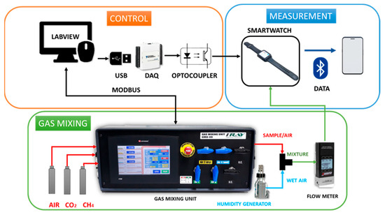 Firstly, the control stage is responsible for communicating with the gas mixing unit and the smartwatch. A National Instruments LabVIEW (Austin, EEUU) application is used to control the gas mixing unit, communication between them is made by MODBUS. LabVIEW application allows the configuration of the total flow of the system, the concentration of the sample gases, the relative humidity and sets the absorption (sample) and desorption (air) time for measurements. In addition, a data acquisition card (DAQ) is used to send digital pulses to the smartwatch when the program changes between adsorption and desorption time.