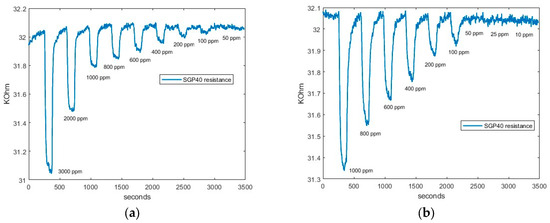 4 concentrations were generated from 1000 ppm to 10 ppm. Measurements were completed with an absorption time of 2 min and a desorption time of 4 min. Samples were taken every 2 s, so the total measurement time was 3478 s, humid air was generated at 40% as regular indoor value, and the total flow programmed was 100 mL/min.