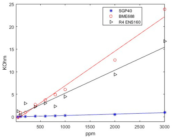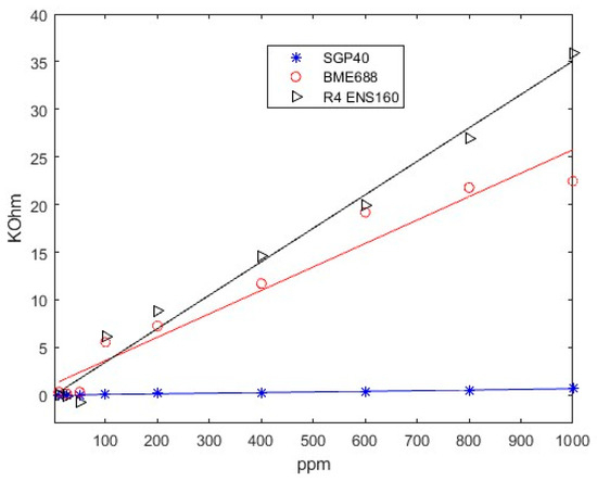Table 1. However, concentrations of these gases below 100 ppm could not be differentiated from baseline. Also, the device was proven to have a good linear response in the whole range of measurements, providing a good prediction model.