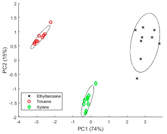 Secondly, the discrimination capabilities of the device were tested with toluene, xylene, and ethylbenzene. PCA results showed that the smartwatch can discriminate the three different gases at a very low concentration. Therefore, it could be helpful in warning workers of leakages with concentrations below the limit detection.
