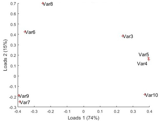 28]. This algorithm returns the coefficients of the principal components also know as loads. Each row of the matrix of coefficients contains the coefficients of a principal component while the number of columns corresponds to the number of variables.