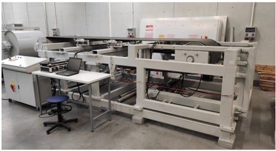 To research the possibility of identifying and quantifying the asymmetry of the belt’s tensioning, repeated experimental measurements were carried out on a test rig used to test the properties of rubber textile conveyor belts. The principal scheme of the test rig is in Figure 3.