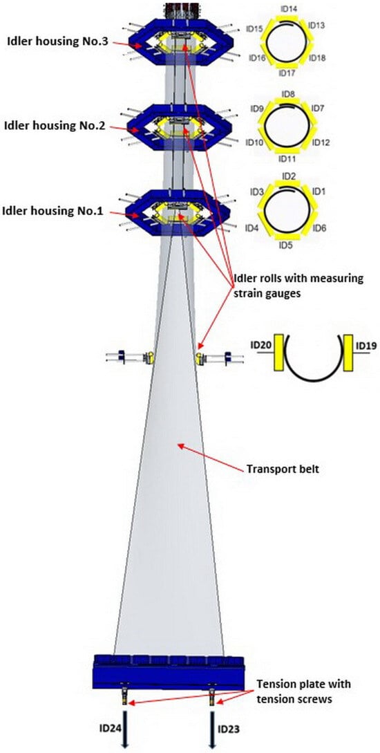 The test rig consists of a stand with three hexagonal idler housings, No. 1, No. 2, No. 3, and a transport belt. In the lower part of the test rig, the conveyor belt unfolds and is fixed using a tension plate, which tensions it to a required value with two tension screws in ID23 and ID24. These tension screws, in addition to contributing to uniform, symmetrical conveyor belt tensioning, enable various states of asymmetric tensioning. Strain gauges continuously measure the size of tension forces (TFs) in ID23 and ID24. In the next part of the test rig, the conveyor belt is gradually folded into an overlapped U shape. The size of reactions to the conveyor belt’s folding into a U shape is continuously measured using two rollers with measuring strain gauges ID19 and ID20. In the central part of the test rig, a gradual folding of the conveyor belt into a circular shape with an overlap follows. The size of reactions to keep the conveyor folded and overlapped is continuously measured using 18 rollers with measuring strain gauges ID1–ID18, located in the three idler housings, No. 1, No. 2, and No. 3. In the upper part of the test rig, the conveyor belt is folded and of a circular shape.