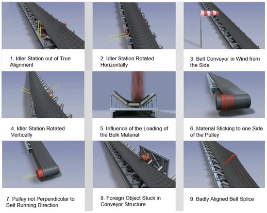 Belt mistracking is a well-known phenomenon and an undesirable operating condition of continuous transport systems. It is widespread in classic belt conveyors. The causes of its formation are in Figure 5.