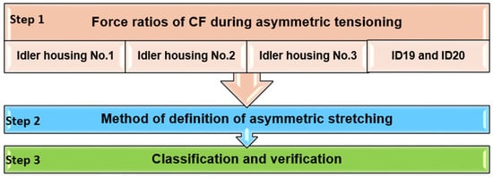 In Step 1, graphical CF curves were analyzed at the rollers’ positions with the measuring strain gauges ID1 to ID20. Figure 7, Figure 8, Figure 9 and Figure 10 show the measured values of the CF for the set value of TF = 40,000 N. The roller’s position with the measuring strain gauge for asymmetric classification suitability was determined by a sufficient (visible) difference in the measured CF values for different levels of the set asymmetry of the TF. The CF range was set as the maximum CF value for each idler housing in Figure 7, Figure 8 and Figure 9. Figure 7 shows that the CF range for idler housing No. 1 was 400 N.