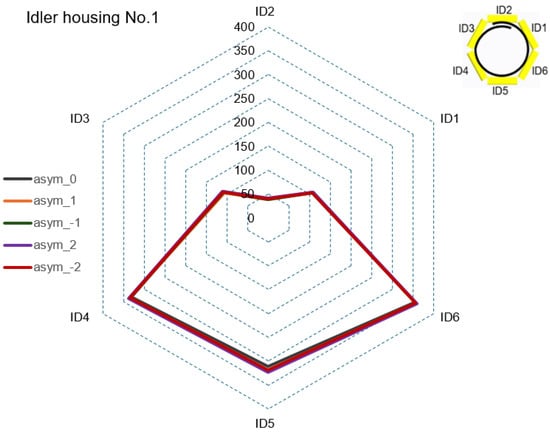 Figure 7 shows that in idler housing No. 1, the variability in CF at the positions of the rollers with measuring strain gauges ID1 to ID6 was insufficient to classify asymmetry for all levels of the set TF asymmetry.