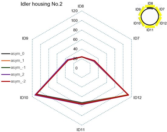 Figure 8 shows the range for idler housing No. 2 at 120 N. It also shows that in idler housing No. 2, the variability in CF at the positions of the rollers with measuring strain gauges ID7 to ID12 was insufficient to classify asymmetry for all levels of the set TF asymmetry.