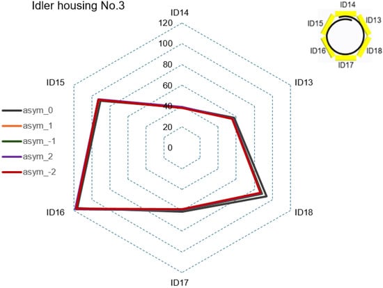 Figure 9 shows the range for idler housing No. 3 at 120 N. It shows that in idler housing No. 3, the variability in CF at the positions of the rollers with measuring strain gauges ID13 to ID18 was insufficient to classify asymmetry for all levels of the set TF asymmetry.