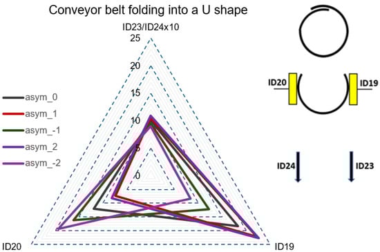 Figure 10 shows the AsymRatio quantity, which had values from 0.89 to 1.12, and the CF values on ID19 and ID20, which had a maximum value of 22.6 N. The AsymRatio, i.e., the share of ID23/ID24, was multiplied 10× to achieve approximately the same values in the graph scale. Figure 10 clearly shows that at the point of the conveyor belt folding into a U shape, the CF variability at the rollers’ positions with measuring strain gauges ID19 and ID20 was sufficient to classify asymmetry for all levels of the set TF asymmetry. Figure 7, Figure 8, Figure 9 and Figure 10 imply that only at the positions of the rollers with measuring strain gauges ID19 and ID20 could the difference in CF values be identified for individual levels of the set TF asymmetry.