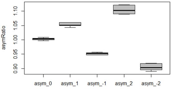 Box plots for the variable AsymRatio illustrate all the asymmetry levels set during the experiment.