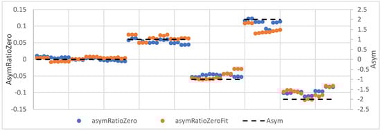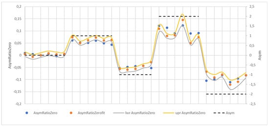 Figure 12 shows the regression model verification by comparing theoretical and empirical values, which makes it clear that the estimate of the AsymRatioZero variable’s values was excellent. The horizontal dashed lines plot the set asymmetry levels for 0, 1, –1, 2, and –2, according to Table 1 (Asym).