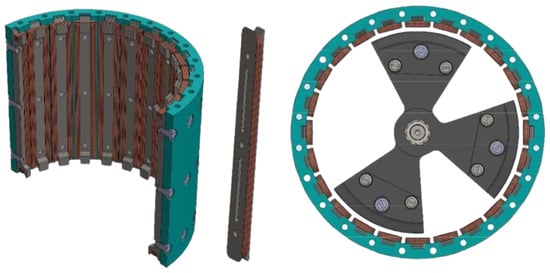 On the other hand, the housing hosts a set of twenty-four coils on its inner curved surface. One half of the housing with its coils is shown in Figure 3. The relative movement of the magnets creates a voltage at the terminals of the coils, which is harnessed to generate power according to Faraday’s law of induction. The design of the device causes each set of magnets to face at least three complete coils, irrespective of their position; see Figure 3.