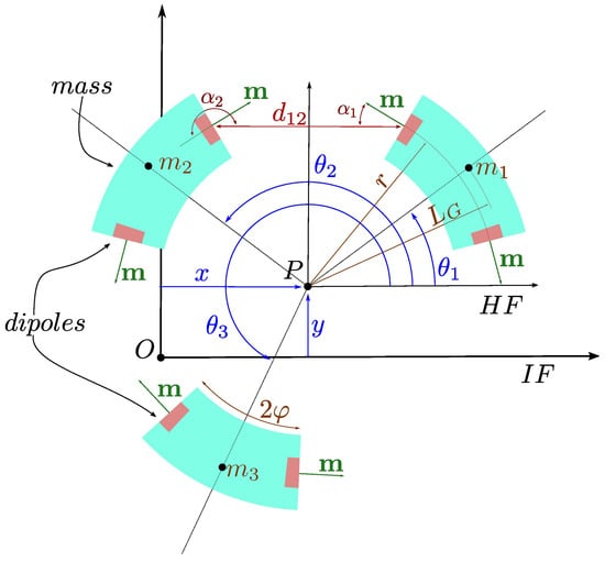 Figure 4 shows a sketch of the device. The centre of the device (point P) is defined with respect to the Inertial Frame (IF) (point O) by means of two coordinates: and . The ith mass is positioned by an angle with respect to the Harvester Frame (HF). For the sake of simplicity, the time dependency of the coordinates from this point onwards has been removed. The centre of gravity (CG) of each of the masses (mass ) is located at a distance from point P. Based on this, for each moving mass, the position of its CG with respect to the IF is provided by