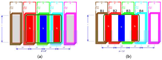 where is the energy generation damping coefficient and is the mechanical damping coefficient. While the second term is simply velocity-proportional, the first one is multiplied by a trigonometric factor. The reason for this term to appear is that, in the case of this harvester, the angular separation between magnets is , which corresponds to a circular distribution of 12 poles (pairs of magnets) per turn. Therefore, the intensity and direction of the magnetic field generated by each pair along the arc through which it moves (in front of and normal to the coils) approximate a sine of period , and, for each mass–magnet set, the function defining the generated power is proportional to both and . Figure 5 shows the relative positions of magnets and coils so that (a) no power is generated and (b) maximum amount of power is generated. For any intermediate position, the power generation would behave as a sinusoidal function of the relative angle .