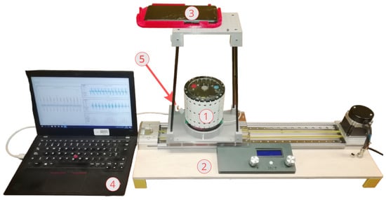This experimental setup consists mainly of five elements. The device to be identified ➀ is mounted on a specifically designed moving platform ➁ that acts as shaker and is the element that provides the kinetic energy that the device harvests. On the upper part of the platform, mounted on a structure, there is a phone ➂ with a high-speed and high-resolution camera (240 fps). In order to measure the accelerations of the moving platform with respect to the IF, needed in Equation (11) to obtain the numerical value of , a triaxial accelerometer (ADXL345) is installed in the electronics of the harvester and is measured together with the power generated by the 24 coils of the harvester. All data are collected using a UART communication protocol through a cabled USB connection and are written to a data table automatically.