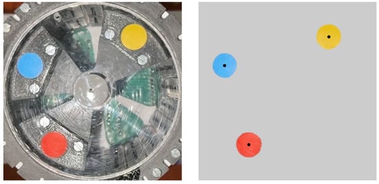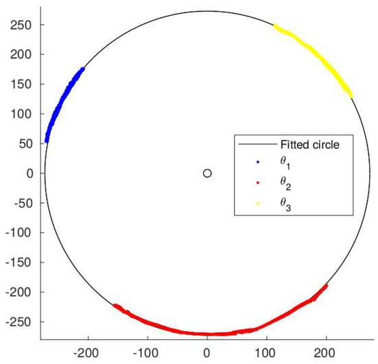 As all the masses and stickers rotate with respect to a common axis, the Cartesian coordinates of all coloured areas should fall on a circumference. Fitting the data to the equation of a circumference [], the radius for the mass rotation and the centre of the harvester are calculated in pixel coordinates. The circle fitted to the measured points of the same experiment is also shown in Figure 8.