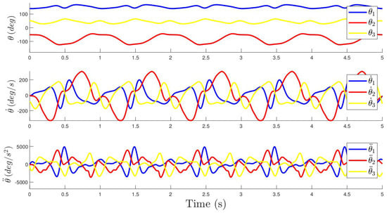 Position, velocity and accelerations of the azimuthal positions of the masses. Each colour indicates the corresponding mass as shown in Figure 7.