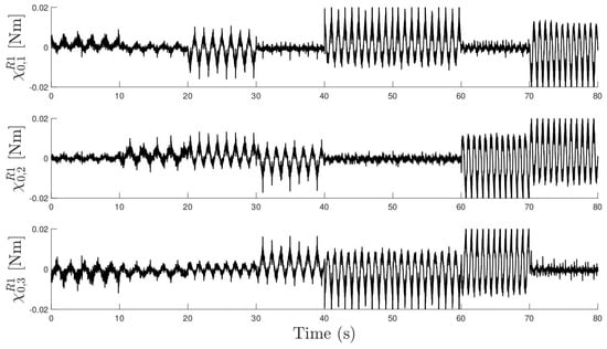 Figure 10 shows a subset of the vector for the resistance . One can observe that, for example, between time instants s and s, for the same excitation frequency, the masses that are moving are different, as intended.