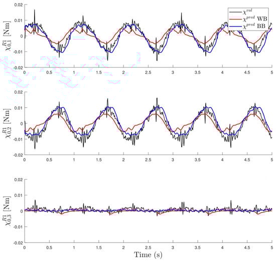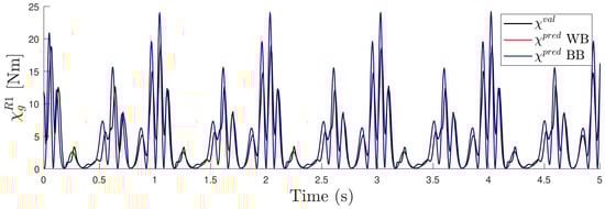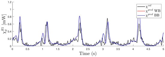 Estimated with the two models (BB and WB) for one case with resistance and frequency 1.0 Hz. In black, measured is also shown for comparison.