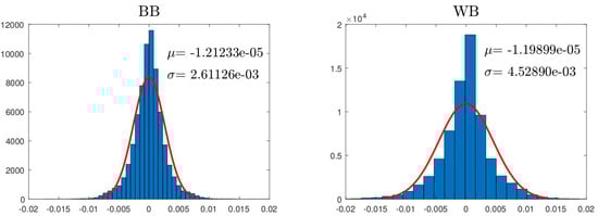 The accuracy of the estimation can be seen in Figure 11, where, for one of the experiments ( and frequency 1.0 Hz), the vector obtained with the two models (BB and WB) is compared with the corresponding measured one . As can be seen, the BB model fits the real measurement better. This is due to its larger generality and flexibility because it has more parameters and can take into account other non-linearities that the WB model does not contemplate. Remember that the WB model assumes that the magnetic interaction is produced by dipoles, while this is not exactly the case. The total accuracy of the two methods can be seen in Figure 12, where the histograms of the residual are shown. For both models, the residual has a mean value that is very small, close to of the maximum amplitude of . As can be observed, the BB model has a standard deviation close to of the range of , while, for the WB model, this value doubles.