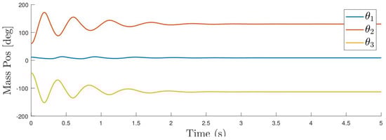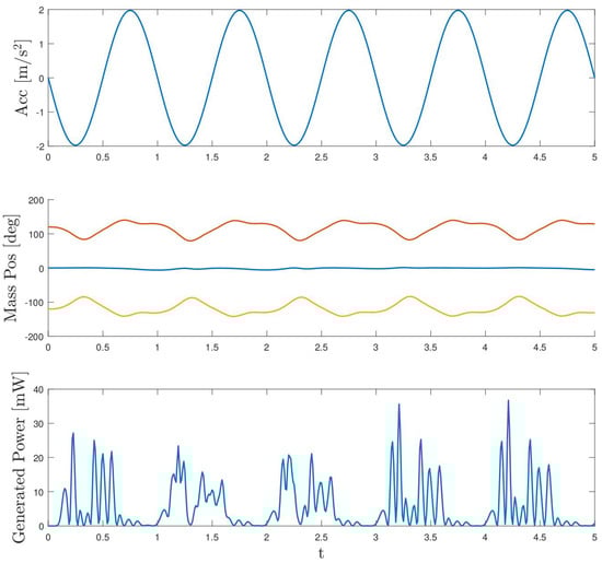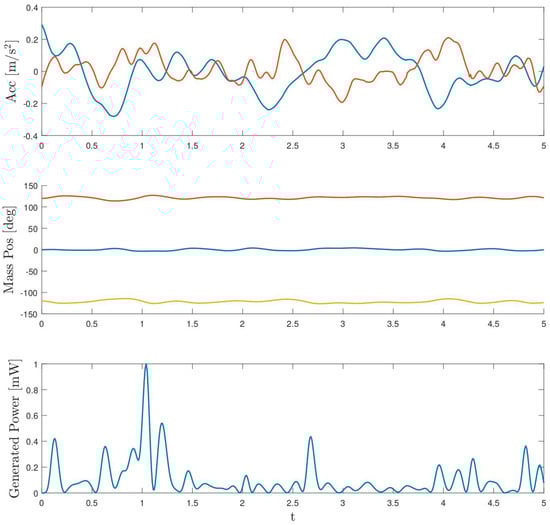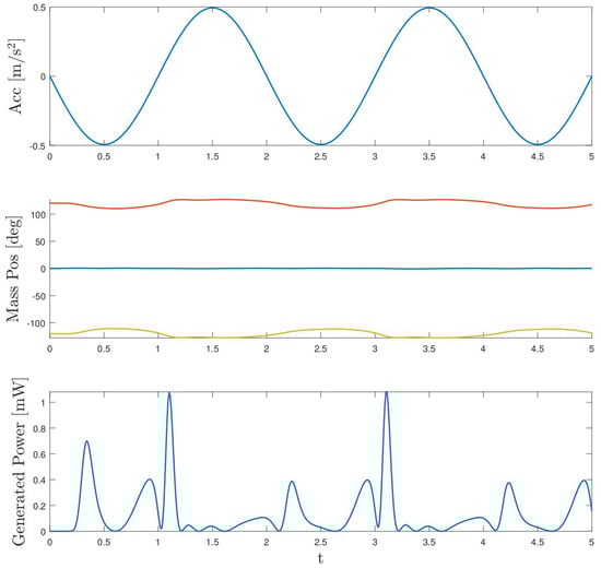 In Figure 16, the system is excited with an acceleration of frequency 1 Hz and amplitude 2 m/s2 with a load resistance of with the intention of reproducing the case presented in the previous section and shown in Figure 11. In Figure 16, one can also see the time evolution of the azimuthal position of the masses starting from an equilibrium position. It can be clearly seen that the oscillatory movements of the masses (mass 3 can be seen very well) have a frequency similar to that of excitation, as expected. As one can see in Figure 16, the generated power has a shape similar to that expected (see Figure 13). In addition, the maximum power values are very close to those measured in this experiment, and the same is true for the total energy generated in five seconds, close to 27.0 mJ. It should be noted that the extracted power does not have exactly the same shape as in the real case because the initial conditions of the simulation are not the same as in the real experiment; i.e., in both cases, the masses are initially oriented in different azimuthal positions. However, as the estimated generated energy is almost the same, in can be concluded that the estimated model satisfactorily reproduces the measured data.