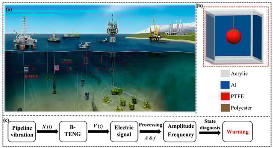 Application scenario and structure of B-TENG sensor. (a) Schematic diagram of B-TENG applied to marine pipeline vibration monitoring; (b) structure of B-TENG; (c) the flow chart of B-TENG for detecting pipeline conditions.