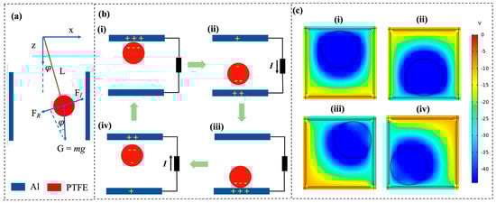 COMSOL Multiphysics software was used to simulate the induced potential distribution of B-TENG under open circuit conditions, and the change process of the electrostatic field was explained by locating charged pellets at different positions, as shown in Figure 3c. In the initial state, the electrode and the surface of the ball are set to a uniform distribution of positive and negative charges, respectively. As shown in Figure 2c(i), when the ball moves upward, the distance between the ball and the top electrode decreases, resulting in a larger electric potential induced by the top electrode compared to the lower electrode. The ball then moves down to contact the bottom electrode (Figure 2c(ii)), generating the opposite induced potentials. Similarly, Figure 2c(iii,iv) are the changes in the electrostatic field as the ball moves to different positions along 45°. The potential difference generated by the periodic swing of the ball drives the electrons to flow back and forth in the external circuit, causing an alternating current to be generated in the external circuit. The simulation results are consistent with the above working principle.