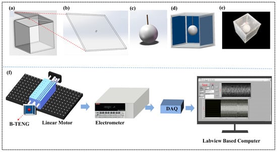 Schematic of B-TENG manufacturing and experimental platform. (a) Acrylic shell; (b) removable upper plate; (c) the ball; (d) schematic diagram of B-TENG; (e) physical diagram of B-TENG; (f) experimental setup of the B-TENG sensor.