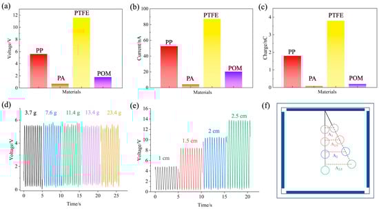 The selection of friction materials is crucial to improve the performance of triboelectric nanogenerators. The only available tool that describes the triboelectrification of materials is a triboelectric series [46]. According to the triboelectric series shown in Figure S3, considering cost and accessibility, a variety of common friction materials such as polyformaldehyde (POM), polypropylene (PP), nylon (PA), and polytetrafluoroethylene (PTFE) were selected for comparative analysis. Figure 4a–c show the output voltage, short-circuit current, and transferred charge of the B-TENG at a vibration frequency of 2 Hz and an amplitude of 14 mm, respectively. It is shown that when PTFE was used as the ball material, the output voltage, short-circuit current, and transferred charge of the B-TENG reached the maximum. This is because POM, PP, PA, and PTFE are at different positions in the friction charge sequence. In contact with the aluminum electrode, PTFE lost electrons more readily than the other three, so the more friction charges the ball carried, the stronger the output performance. Meanwhile, because PA material and aluminum are the closest in the quantified triboelectric serials, the amount of friction charge generated was small, and the output electrical signal was the weakest. According to the experimental results, the ball material of B-TENG was made of PTFE, which could generate larger electrical signals, effectively reduce the influence of external free charge on the output of the device and improve the signal-to-noise ratio of the device. In addition, because PTFE is an electric material, the surface charge can be maintained for a long time. After that, even if the electrode is not in contact, a strong electrical signal output can still be generated between the PTFE ball and the electrode due to the principle of electrostatic induction. Therefore, in the subsequent experiments, PTFE was chosen as the friction layer material for further study.