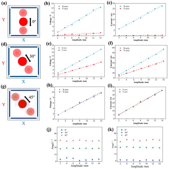 Influence of vibration direction on the output performance of B-TENG at different amplitudes with a fixed frequency of 2 Hz. (a) Schematic diagram in top view when the vibration angle is 0°; (b) relationship between voltage and amplitude; (c) relationship between current and amplitude; (d) schematic diagram in top view when the vibration angle is 30°; (e) relationship between voltage and amplitude; (f) relationship between current and amplitude; (g) schematic diagram in top view when the vibration angle is 45°; (h) relationship between voltage and amplitude; (i) relationship between current and amplitude; the angle calculated from the B-TENG (j) voltage; (k) current.